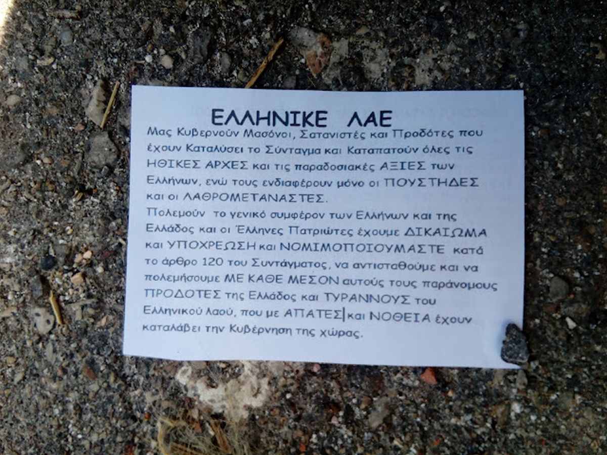 «Ελληνικέ λαέ» έγραφε, μεταξύ άλλων, το φέιγ βολάν, «μας κυβερνούν μασόνοι, σατανιστές και προδότες που έχουν καταλύσει το σύνταγμα και καταπατούν όλες τις ηθικές αρχές και τις παραδοσιακές αξίες των Ελλήνων».
