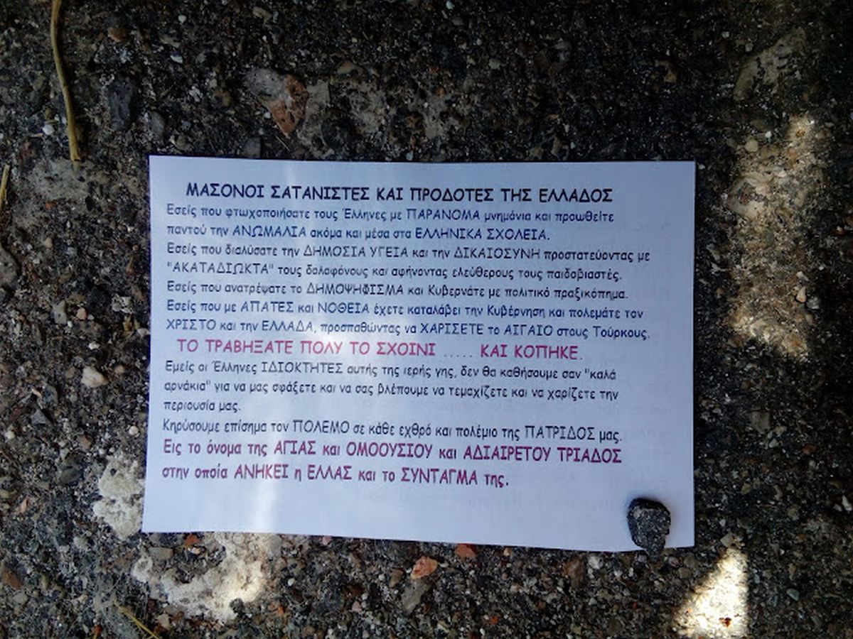 «Το τραβήξατε πολύ το σχοινί και κόπηκε» λέει απευθυνόμενους στους μασόνους. «Εμείς οι έλληνες ιδιοκτήτες αυτής της ιερής γης, δεν θα καθήσουμε σαν “καλά αρνάκια” για να μας σφάξετε και να σας βλέπουμε να τεμαχίζετε και να χαρίζετε την περιουσίας μας […] Κηρύσσουμε τον πόλεμο σε κάθε εχθρό της πατρίδας μας» γράφει.