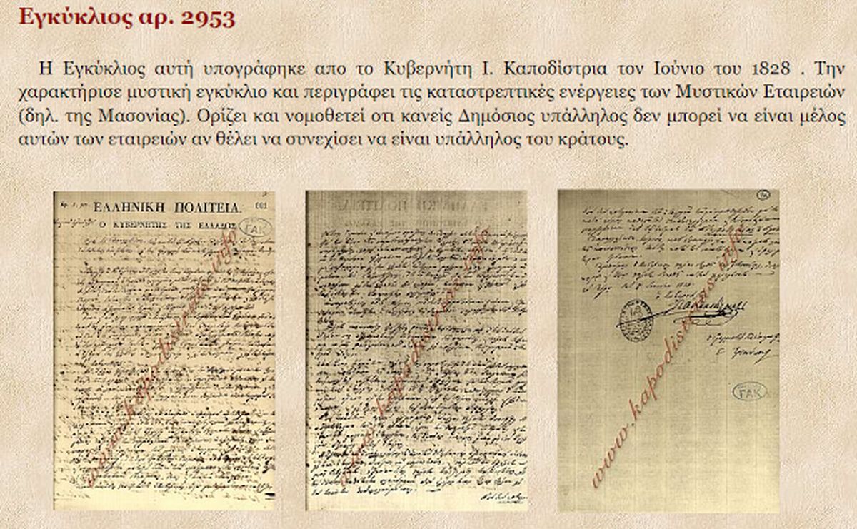 Δηλώνει οπαδός του Ιωάννη Καποδίστρια που «δολοφονήθηκε από τη μασονία» και παραθέτει τη «μυστική εγκύκλιο με την οποία ο Ιωάννης Καποδίστριας προσπάθησε να πολεμήσει τη μασονία στην Ελλάδα».