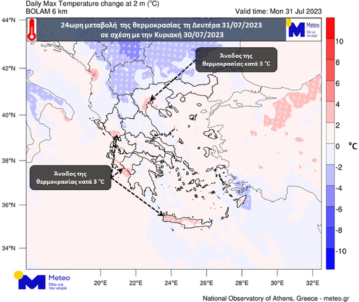 Η εκτιμώμενη 24ωρη μεταβολή της θερμοκρασίας τη Δευτέρα 31/07, σε σχέση με την αντίστοιχη θερμοκρασία της Κυριακής 30/07/2023. Με μπλε αποχρώσεις η μείωση της θερμοκρασίας, ενώ με κόκκινες αποχρώσεις η αύξηση, όπως υπολογίστηκε από το αριθμητικό μοντέλο πρόγνωσης καιρού του Εθνικού Αστεροσκοπείου Αθηνών/meteo.gr.