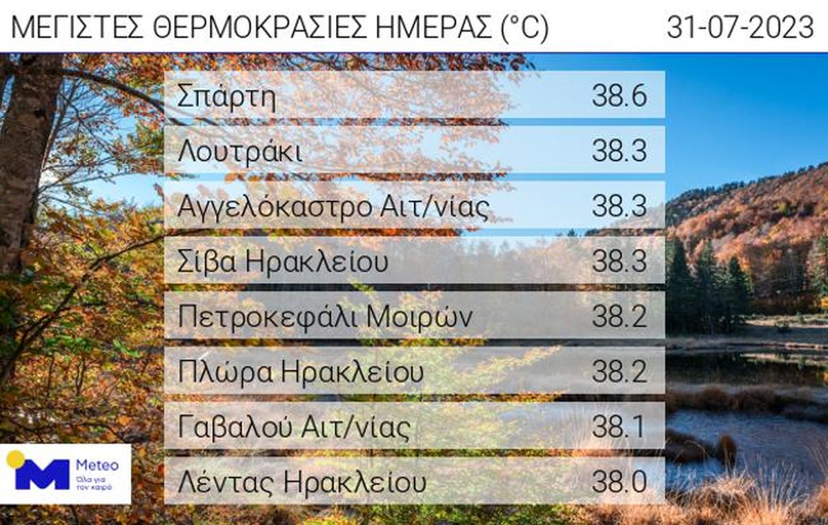 Σύμφωνα με το δίκτυο αυτόματων μετεωρολογικών σταθμών του Εθνικού Αστεροσκοπείου Αθηνών/meteo.gr οι οκτώ υψηλότερες μέγιστες θερμοκρασίες κατά τις μεσημεριανές ώρες της Δευτέρας 31/07 σημειώθηκαν σε Σπάρτη, Λουτράκι, Αγγελόκαστρο Αιτωλοακαρνανίας, Σίβα Ηρακλείου, Πετροκεφάλι Μοιρών, Πλώρα Ηρακλείου, Γαβαλού Αιτωλοακαρνανίας, Λέντα Ηρακλείου.