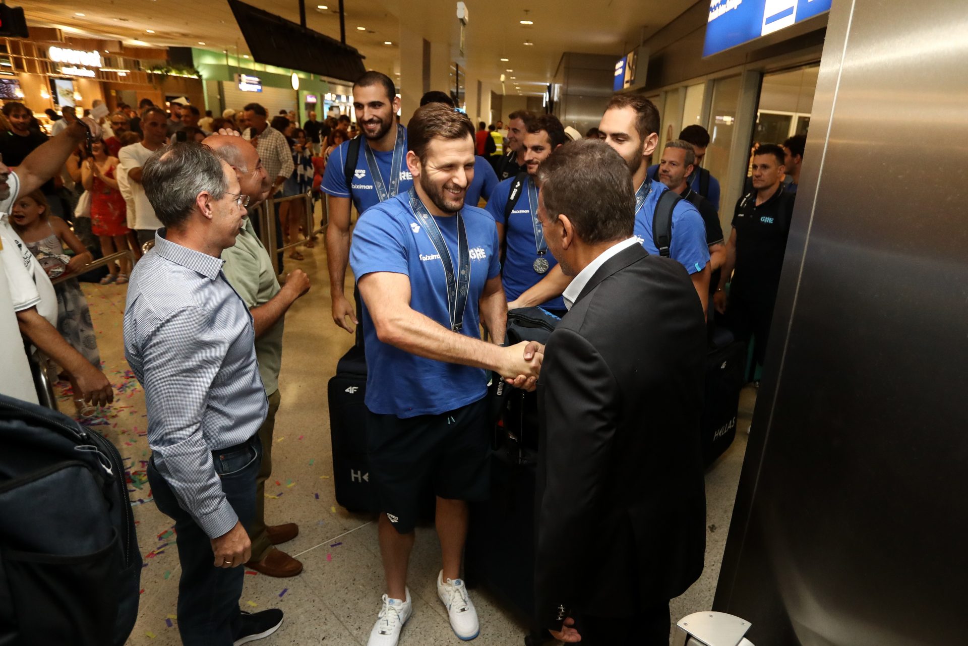 Της άξιζε της εθνικής ομάδας πόλο η θερμή υποδοχή που τους επιφύλαξαν συγγενείς, φίλοι, δημοσιογράφοι και απλός κόσμο στο Ελευθέριος Βενιζέλος, στη 1 μετά τα μεσάνυχτα της Δευτέρας (31/7).