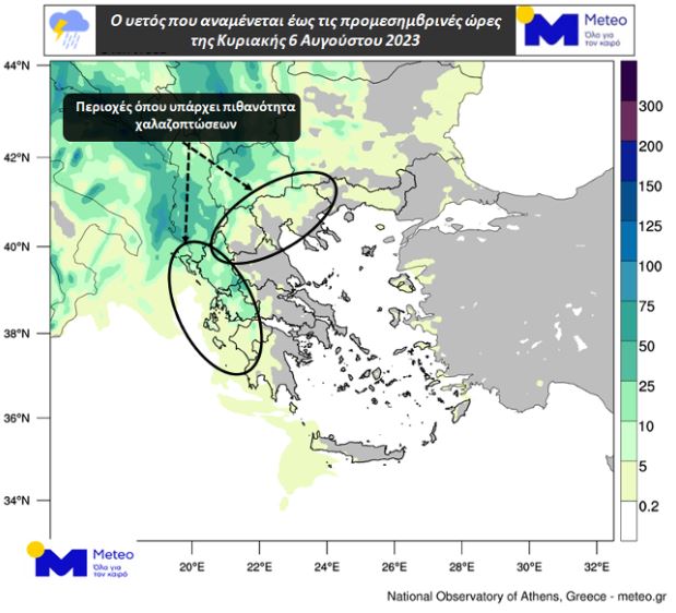 Σύμφωνα με τα τελευταία προγνωστικά δεδομένα του Εθνικού Αστεροσκοπείου Αθηνών / meteo.gr, βαρομετρικό χαμηλό που θα κινηθεί από την Βόρεια Ιταλία προς τα Βαλκάνια θα επηρεάσει τον καιρό της χώρας από το μεσημέρι του Σαββάτου 05/08. Τοπικές βροχές και καταιγίδες θα εκδηλωθούν αρχικά στο Ιόνιο και στα δυτικά και βορειοδυτικά ηπειρωτικά, οι οποίες κατά τη διάρκεια την νύχτας προς Κυριακή 06/08 θα επεκταθούν στην υπόλοιπη Μακεδονία, στα δυτικά και βόρεια τμήματα της Θεσσαλίας και στη Δυτική Πελοπόννησο. Πιθανότητα χαλαζοπτώσεων υπάρχει για τη Μακεδονία, το Βόρειο Ιόνιο, την Ήπειρο, τη Δυτική Στερεά και τη Βορειοδυτική Πελοπόννησο. Στη συνέχεια, από τις πρωινές και έως τις προμεσημβρινές ώρες της Κυριακής 06/08, σποραδικές βροχές θα σημειωθούν στη Θράκη και στα ορεινά ηπειρωτικά. Στον σχετικό χάρτη παρουσιάζεται ο υετός που αναμένεται έως τις προμεσημβρινές ώρες της Κυριακής 06/08 καθώς και οι περιοχές όπου υπάρχει πιθανότητα χαλαζόπτωσης.