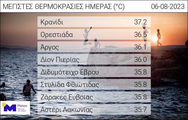Στον πίνακα που ακολουθεί παρουσιάζονται οι 8 σταθμοί του δικτύου αυτόματων μετεωρολογικών σταθμών του Εθνικού Αστεροσκοπείου Αθηνών / meteo.gr που κατέγραψαν τις υψηλότερες μέγιστες θερμοκρασίες το μεσημέρι του Σαββάτου 05/08.