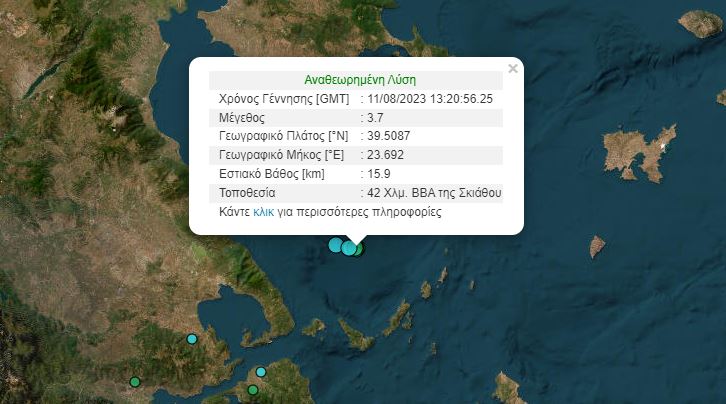 Σεισμός μεγέθους 3,7 βαθμών της κλίμακας Ρίχτερ σημειώθηκε το μεσημέρι της Παρασκευής (11/8) στη θαλάσσια περιοχή βόρεια των Σποράδων και νοτίως της Χαλκιδικής.
