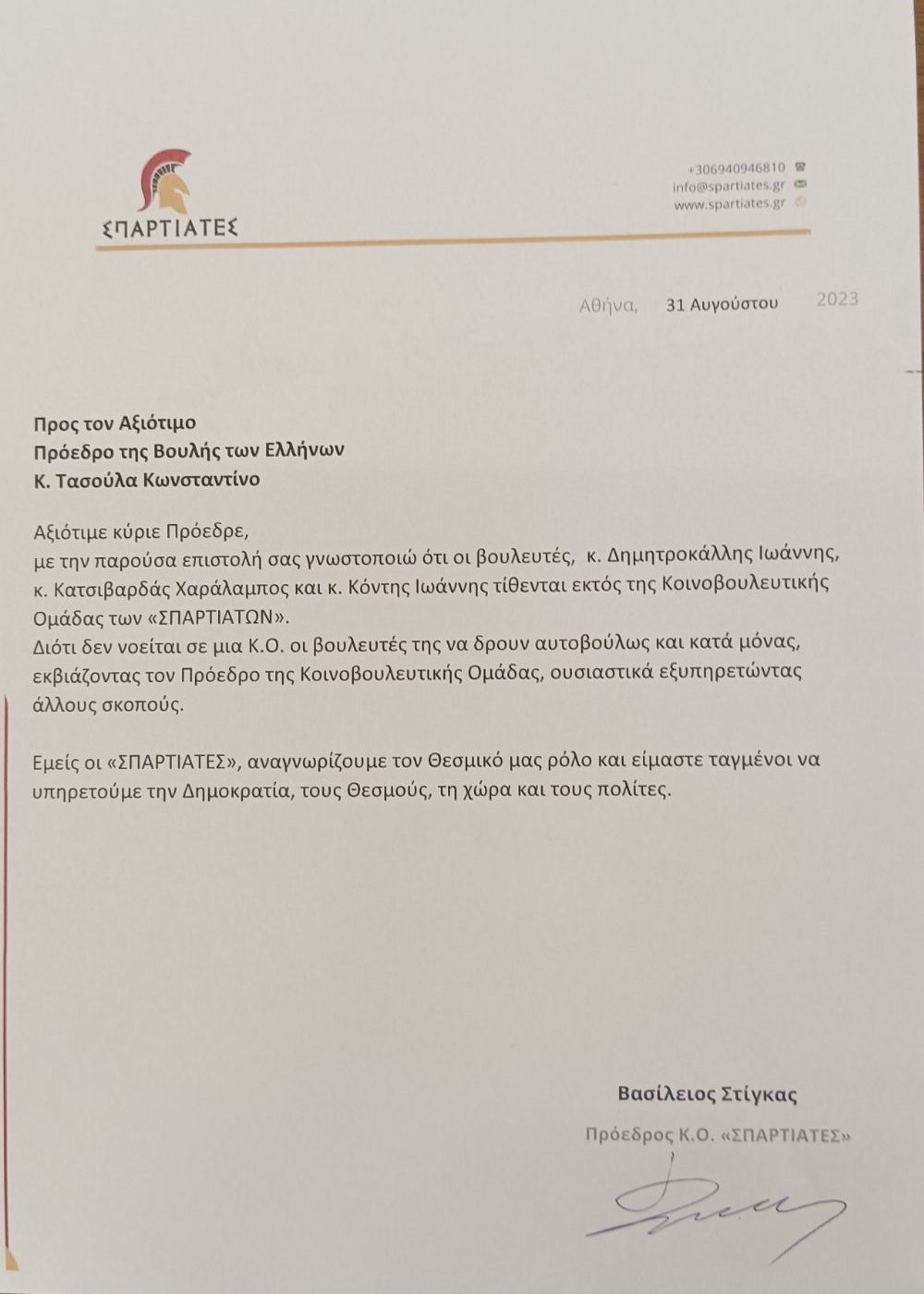 Ως εκ τούτου, του είπε, ότι είναι λογικό να υπάρξει και εγγράφως «μια τέτοια διατύπωση της εξέλιξης ώστε να εκδοθεί και η απαραίτητη ληξιαρχική πράξη», κάτι που σημαίνεται πρακτικά, ότι υπό το βάρος των εξελίξεων αυτών το μόνο που μένει στον κ. Στίγκα είναι να θέσει εκτός Κ.Ο. των Σπαρτιατών τους «αντάρτες» βουλευτές του.