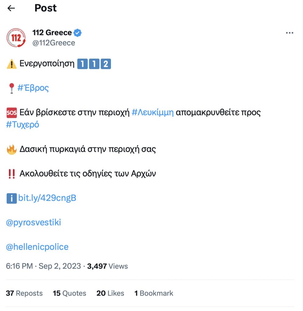 Το μήνυμα γράφει: «Ενεργοποίηση 112 στον Έβρο. Εάν βρίσκεστε στην περιοχή Λευκίμμη απομακρυνθείτε προς Τυχερό. Δασική πυρκαγιά στην περιοχή σας. Ακολουθείτε τις οδηγίες των Αρχών».