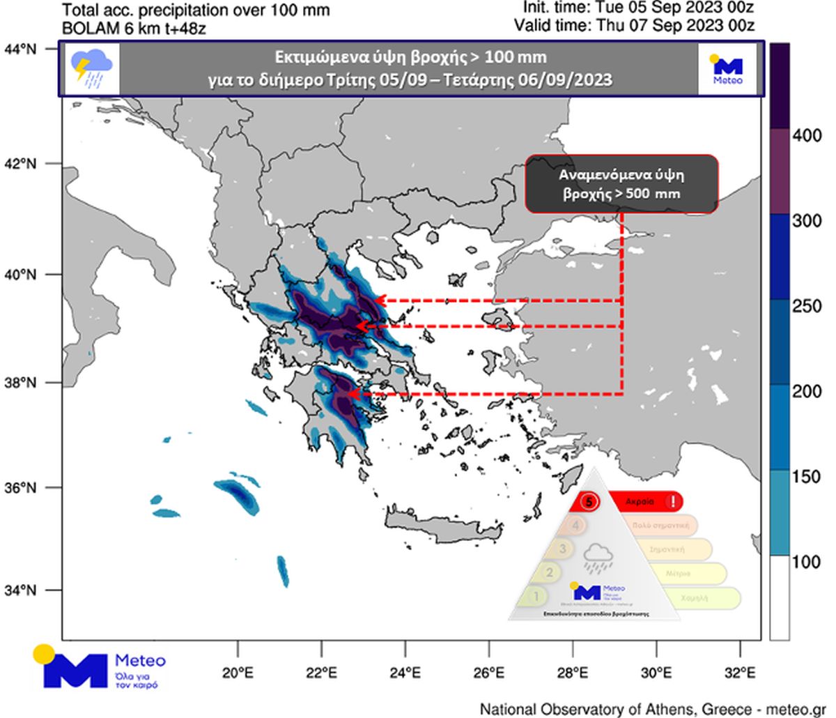 Aπό την επεξεργασία των προγνωστικών στοιχείων του αριθμητικού μοντέλου πρόγνωσης καιρού του Εθνικού Αστεροσκοπείου Αθηνών/Meteo.gr, το διήμερο Τρίτης και Τετάρτης στην περιοχή του Πηλίου, που ήδη αντιμετωπίζει πλημμυρικά επεισόδια, αναμένονται ~650-700 mm, ενώ στην περιοχή νότια του νομού Καρδίτσας ~550-600 mm.