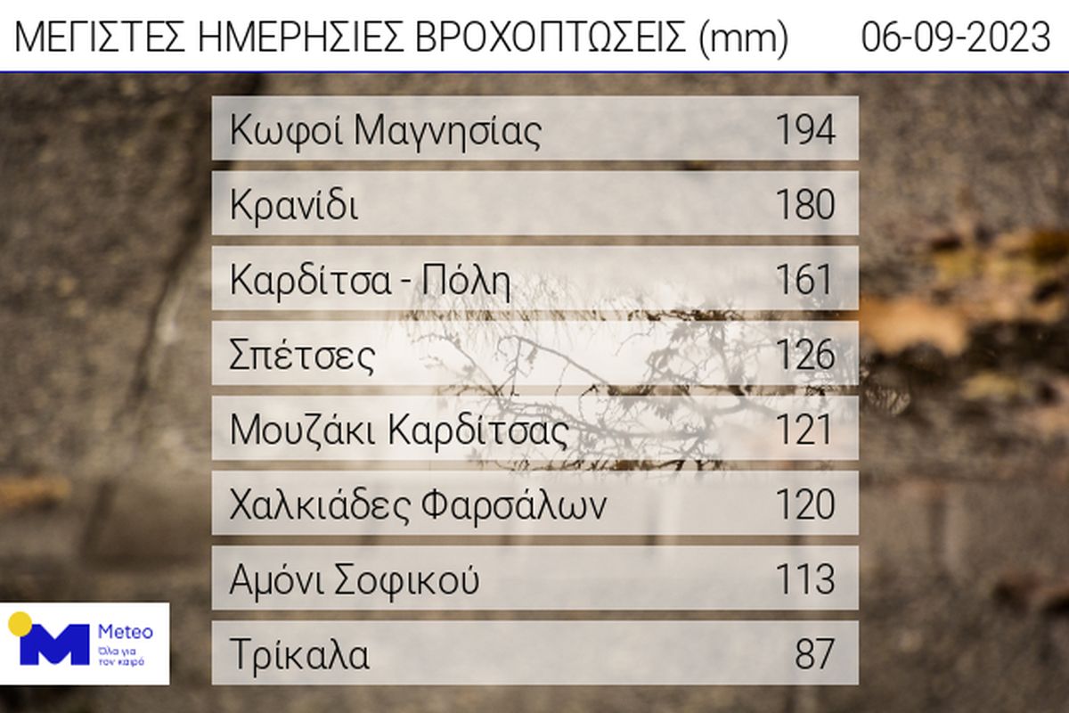 Σύμφωνα με το δίκτυο αυτόματων μετεωρολογικών σταθμών του Εθνικού Αστεροσκοπείου Αθηνών/meteo.gr το μεγαλύτερο ύψος βροχής σήμερα, από τα μεσάνυχτα (00:00) έως τις πρωινές ώρες (08:30) σημειώθηκε στους Κωφούς Μαγνησίας με 194 mm. Ακολουθούν το Κρανίδι (180), η πόλη της Καρδίτσας (161), οι Σπέτσες (126), το Μουζάκι Καρδίτσας (121) και οι Χαλκιάδες Φαρσάλων (120).