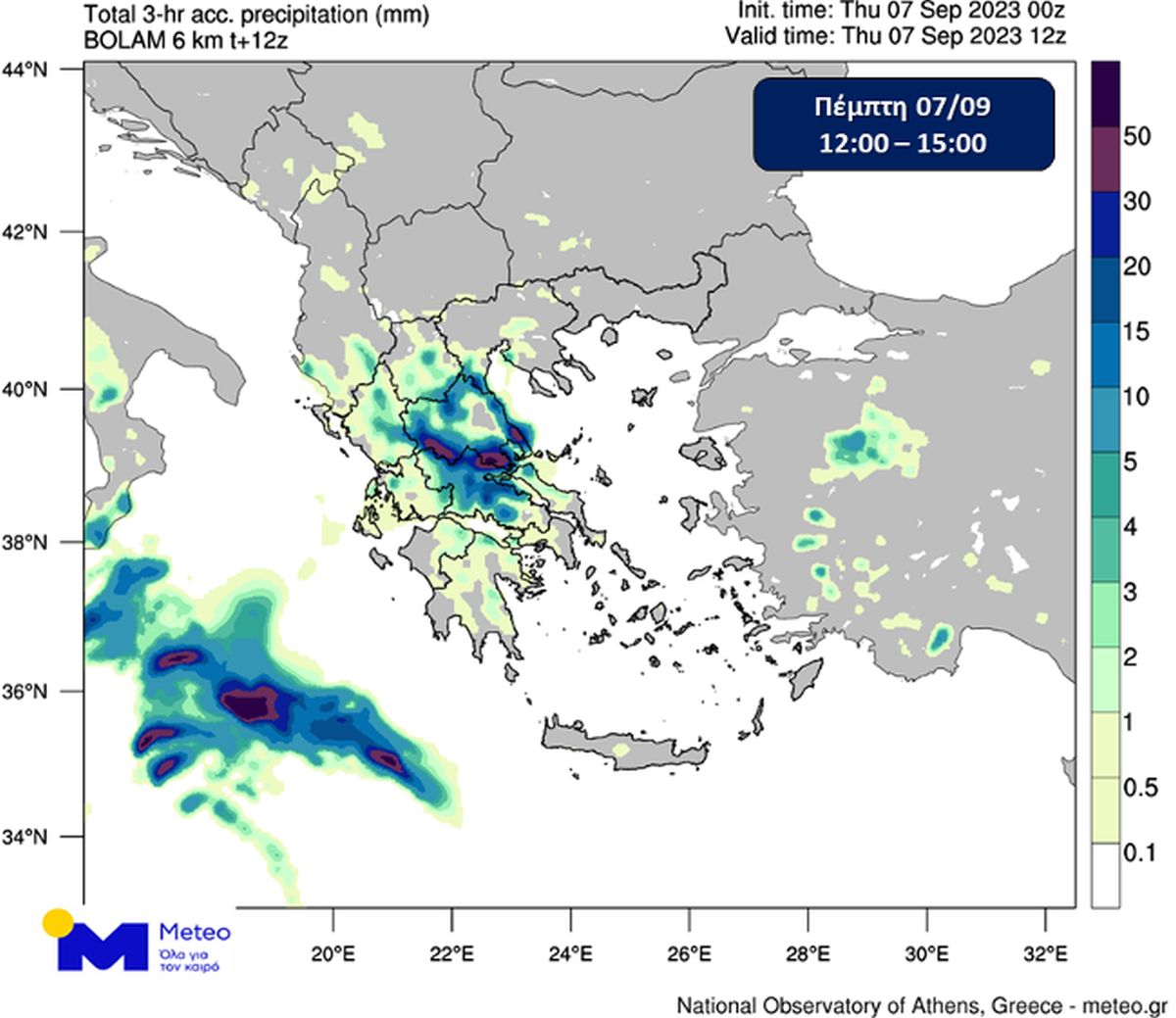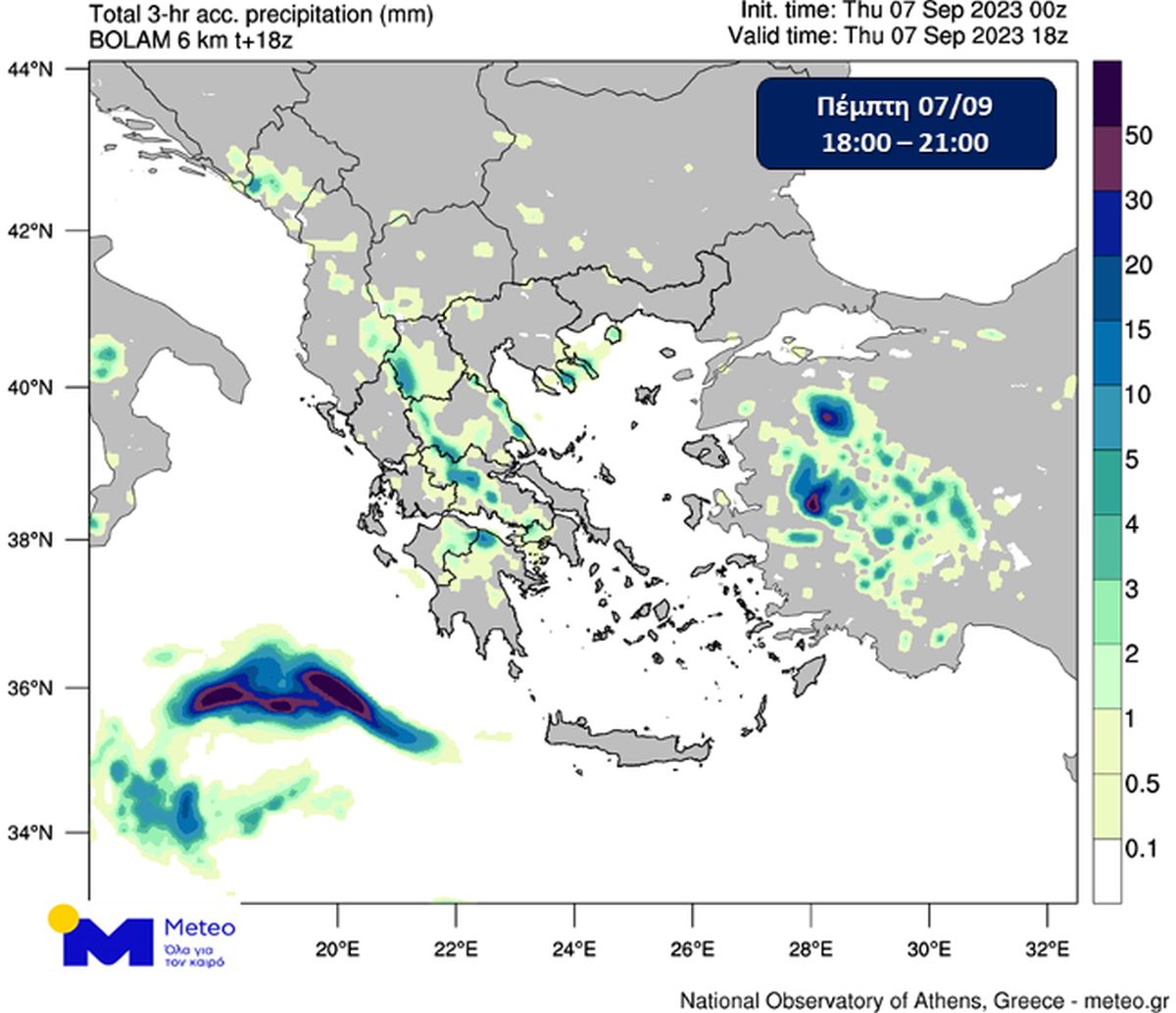 Στην παρακάτω Ομάδα Χαρτών παρουσιάζεται το εκτιμώμενο ύψος βροχής για επιλεγμένα τρίωρα των μεσημεριανών και βραδινών ωρών της Πέμπτης 07/09, όπως υπολογίστηκε από το αριθμητικό μοντέλο πρόγνωσης καιρού του Εθνικού Αστεροσκοπείου Αθηνών/Meteo.gr.