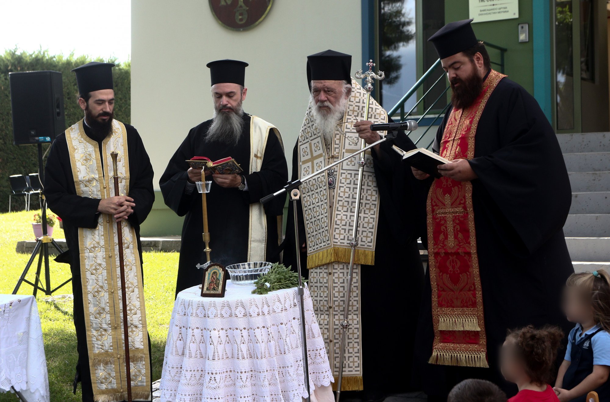 Τον Αρχιεπίσκοπο Ιερώνυμο συνόδευαν ο γενικός αρχιερατικός επίτροπος, αρχιμανδρίτης Ιάκωβος Ανδριόπουλος και ο αρχιδιάκονος Ιωάννης Μπούτσης, ενώ τους υποδέχθηκαν η διευθύντρια του σχολείου, Κατερίνα Ράπτη, το προσωπικό, γονείς και μαθητές.