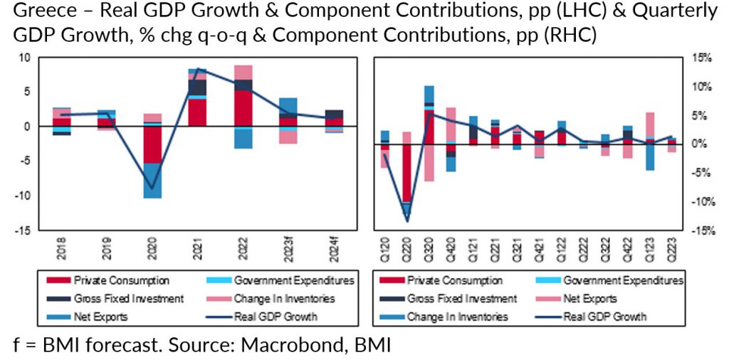 Βραχυπρόθεσμα, η ιδιωτική κατανάλωση θα παραμείνει ο κύριος μοχλός ανάπτυξης στην Ελλάδα, συνεισφέροντας 1,3 ποσοστιαίες μονάδες στην ανάπτυξη το 2023 και 1,2 ποσοστιαίες μονάδες το 2024. Μετά την ανθεκτική ζήτηση, η Fitch αναμένει περαιτέρω εξασθένηση των αντίξοων ανέμων.