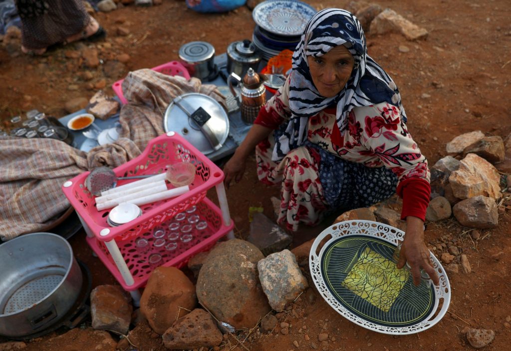 Μια γυναίκα πλένει πιάτα έξω απο ένα σχολείο που μετατράπηκε σε καταφύγιο μετά το σεισμό στο Μαρόκο