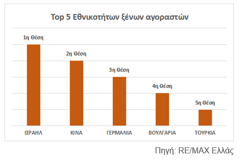 Ανάμεσα στις πέντε πιο δημοφιλείς εθνικότητες ξένων αγοραστών στην Ελλάδα κατατάσσεται το Ισραήλ κατακτώντας την 1η θέση και ακολουθούν η Κίνα και η Γερμανία στην 2η και 3η θέση αντίστοιχα. Η πεντάδα ολοκληρώνεται με τη Βουλγαρία και την Τουρκία. Αγορές καταγράφηκαν και από άλλες χώρες με επικρατέστερες χώρες της Ε.Ε., την Ιταλία, τη Γαλλία και την Ολλανδία και το Ηνωμένο Βασίλειο από χώρες εκτός Ε.Ε.