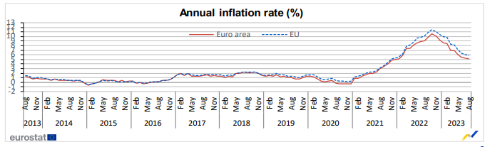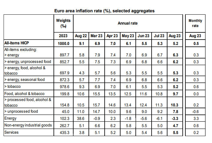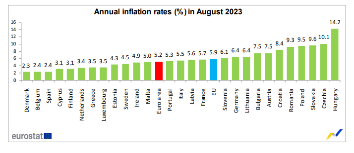 Τα χαμηλότερα ποσοστά καταγράφηκαν στη Δανία (2,3%), την Ισπανία και το Βέλγιο (και στις δύο χώρες 2,4%). Τα υψηλότερα ποσοστά σημειώθηκαν στην Ουγγαρία (14,2%), την Τσεχία (10,1%) και τη Σλοβακία (9,6%). Σε σύγκριση με τον Ιούλιο, σε ετήσια βάση ο πληθωρισμός μειώθηκε σε δεκαπέντε κράτη-μέλη, σε ένα κράτος παρέμεινε σταθερός και σε έντεκα αυξήθηκε.