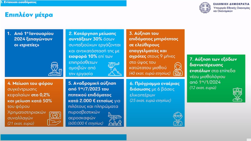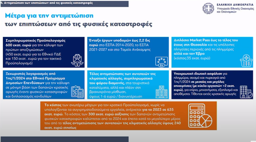 Το κόστος των νέων μέτρων για τη διετία 2023- 2024 ανέρχεται σε 1 δισ. ευρώ και συνολικά για την περίοδο αυτή σε 2,5 δισ. ευρώ, χωρίς τις αποζημιώσεις για τις φυσικές καταστροφές.