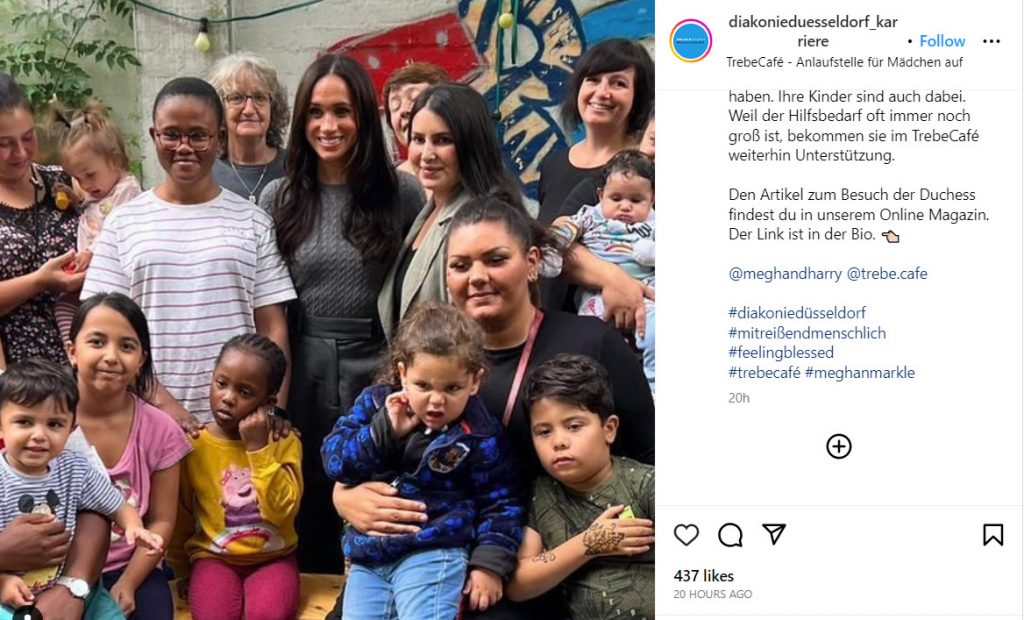 Φωτογραφίες της Δούκισσας του Σάσεξ εμφανίστηκαν στο Instagram Story του TrebeCafé και δείχνουν τη Μέγκαν να συζητάει με ορισμένα μέλη της κοινότητας. Το TrebeCafé, το οποίο υποστηρίζει γυναίκες και κορίτσια που είναι άστεγες, μοιράστηκε φωτογραφίες της Δούκισσας να μιλάει με ένα κοριτσάκι και να χαμογελά βγάζοντας φωτογραφία με μια γυναίκα.