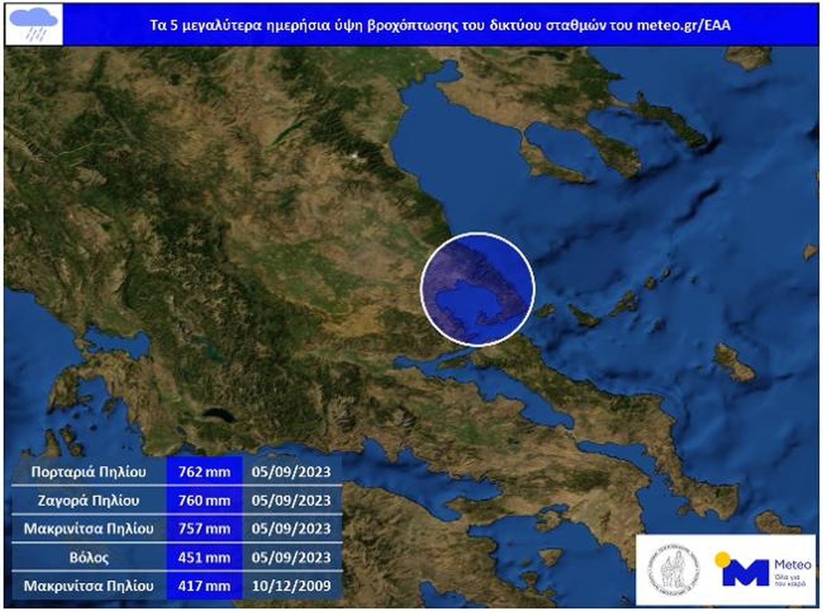 Στα 1.235 χιλιοστά ανέρχεται το ύψος βροχόπτωσης που έπεσε (μέχρι τις 20/9) λόγω της κακοκαιρίας Daniel, στη Μακρινίτσα στο Πήλιο, τιμή που αποτελεί ήδη το μεγαλύτερο μηνιαίο ύψος βροχόπτωσης που έχει καταγραφεί ποτέ στην Ευρώπη.