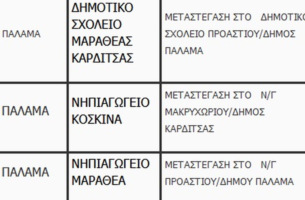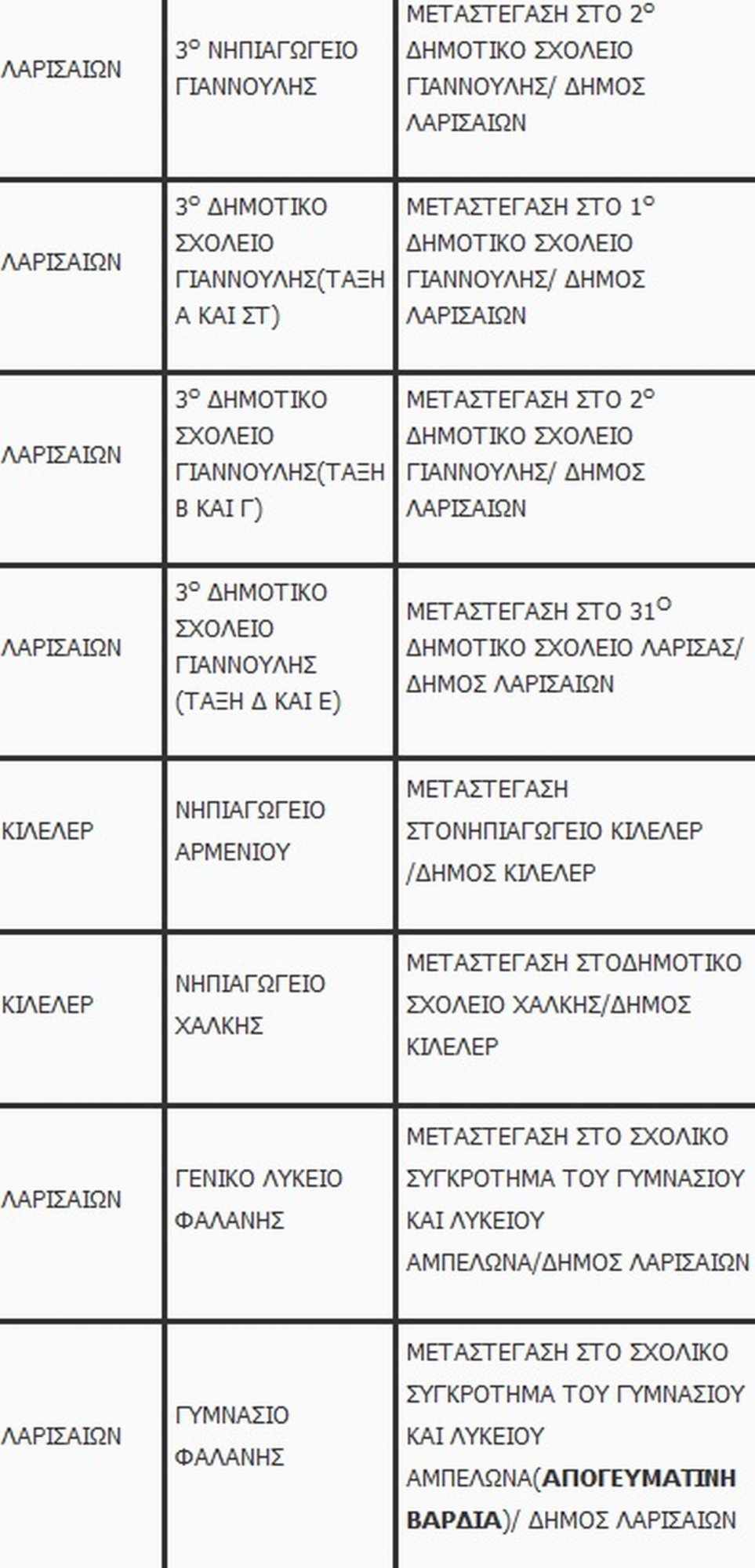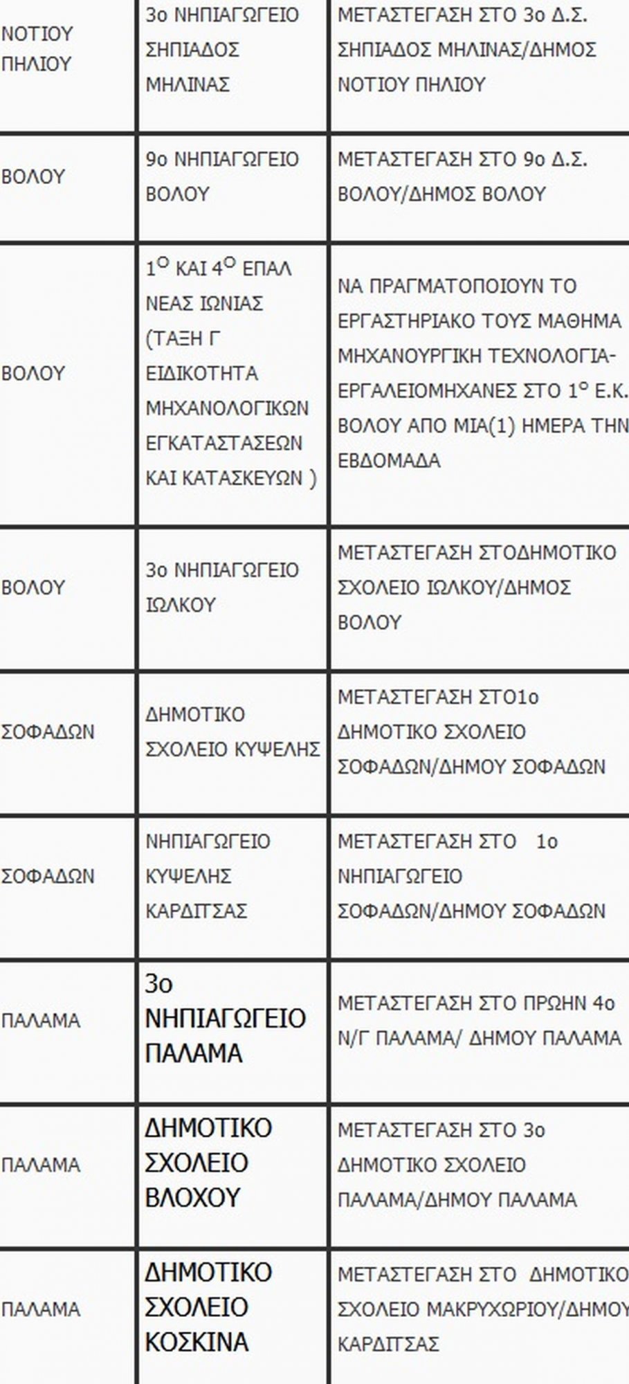 - Θα μεταστεγαστούν προσωρινά σε κτίρια σχολικών μονάδων στον ίδιο ή σε όμορους δήμους και σε πρωινή βάρδια (εκτός δύο περιπτώσεων όπου ρητώς αναφέρεται απογευματινή βάρδια) οι παρακάτω σχολικές μονάδες ή τάξεις σχολικών μονάδων. Η μεταφορά των μαθητών των παραπάνω σχολείων έχει προβλεφθεί και θα καλυφθεί από την Περιφέρεια Θεσσαλίας.