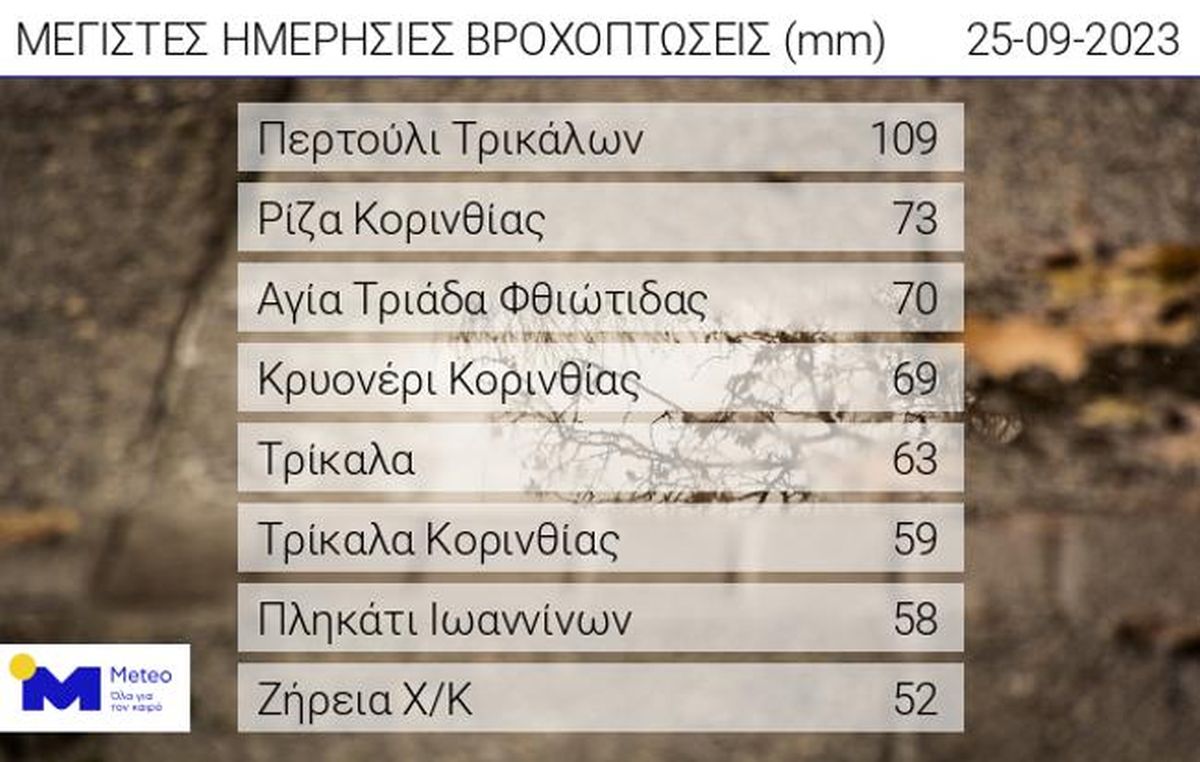 Το μεγαλύτερο ύψος βροχής καταγράφεται στο Περτούλι Τρικάλων και είναι ίσο με 109 χιλιοστά. Στον πίνακα που ακολουθεί παρουσιάζονται τα 8 μεγαλύτερα ύψη βροχόπτωσης.