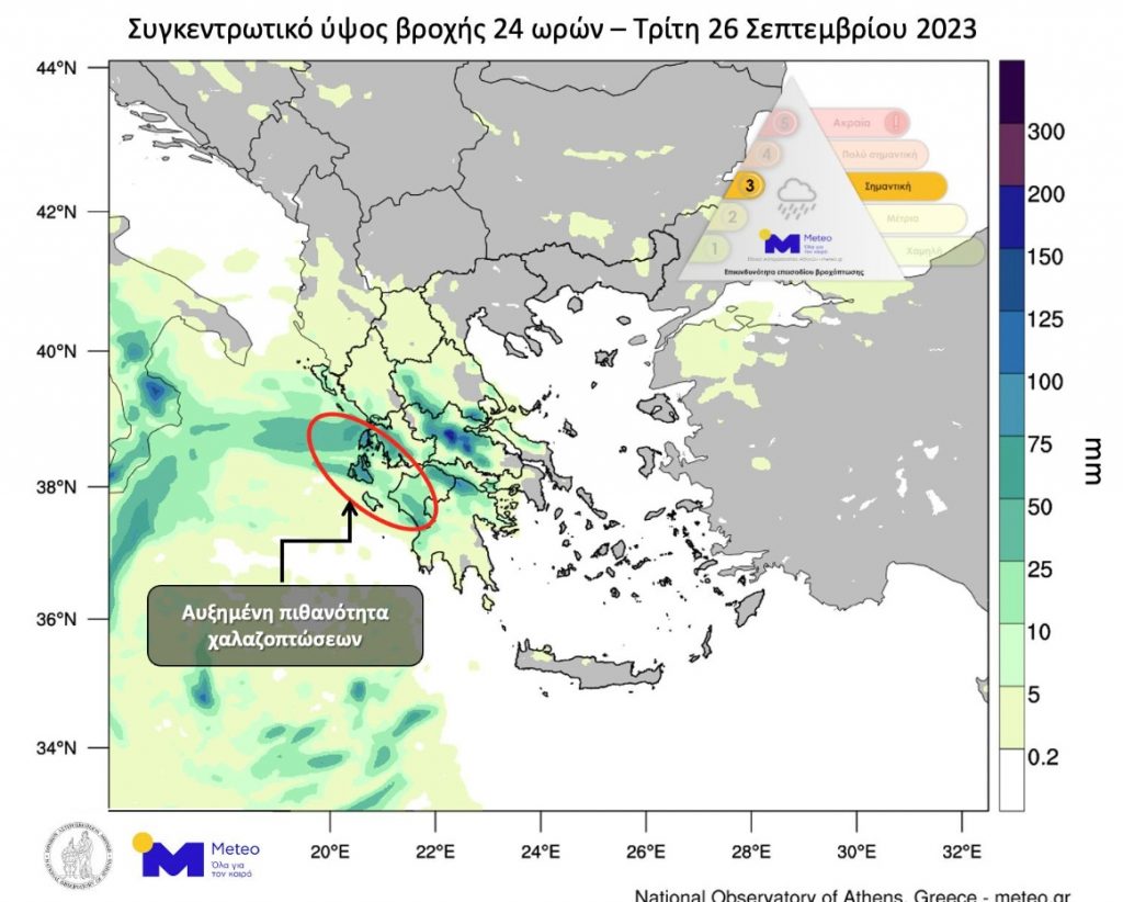 Στον προγνωστικό χάρτη που ακολουθεί απεικονίζεται η εκτιμώμενη γεωγραφική κατανομή των αθροιστικών βροχοπτώσεων (σε χιλιοστά) μέχρι και το πέρας της Τρίτης 26/09. Με βαθύτερες αποχρώσεις αποτυπώνονται τα μεγαλύτερα ύψη βροχόπτωσης.