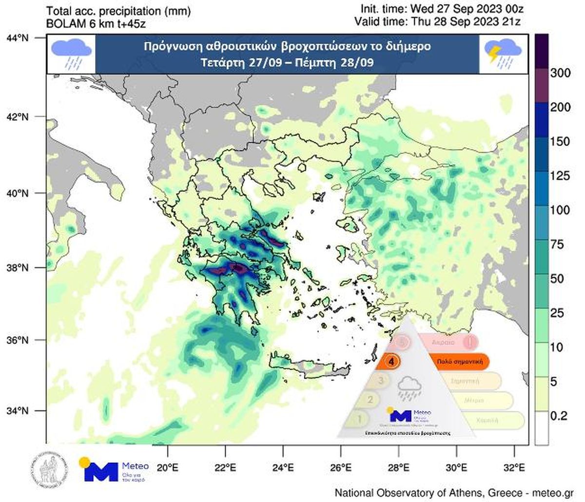 Τα φαινόμενα σε πρώτη φάση θα επεκταθούν στα Κύθηρα, στις Σποράδες και στη Δυτική Κρήτη και σε δεύτερη φάση σε αρκετά νησιωτικά τμήματα του Αιγαίου. Σύμφωνα με την κατηγοριοποίηση του επεισοδίου βροχόπτωσης (RPI), η οποία εφαρμόζεται από τη μονάδα Meteo του Εθνικού Αστεροσκοπείου Αθηνών, το επεισόδιο βροχόπτωσης την Τετάρτη 27/09 αναβαθμίζεται στην Κατηγορία 4 (Πολύ Σημαντική).
