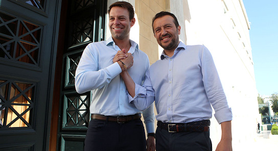 Αμέσως μετά τον πρώτο γύρο ο κ. Νίκος Παπάς ανακοινώνει στα σκαλιά της Βουλής, την υποστήριξή του στον κ. Κασσελάκη. Η φωτογραφία που βγαίνουν μαζί, ντυμένοι σαν δυο σταγόνες νερό, μαρτυρά εύγλωττα τη μελλοντική στενή τους συνεργασία.
