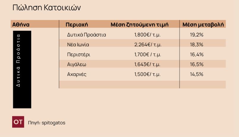 Συνολικά τα δυτικά προάστια κατέγραψαν ετήσια αύξηση σε ποσοστό 19,2% το γ’ τρίμηνο του 2023 με τη μέση ζητούμενη τιμή να φθάνει πλέον τα 1.800 ευρώ ανά τ.μ.