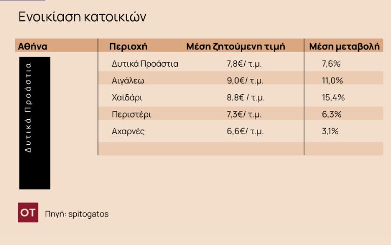 Στα δυτικά προάστια, η υψηλότερη άνοδος στα ενοίκια καταγράφεται στο Χαϊδάρι (+15,4% στα 8,8 ευρώ ανά τ.μ. μηνιαίως).