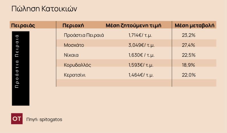 Με βάση τα στοιχεία που παραχώρησε η Spitogatos Insights στον ΟΤ, στην πόλη του Πειραιά η μέση ζητούμενη τιμή πώλησης καταγράφει άνοδο 30% μέσα σε μια διετία, καθώς έχει φθάσει πλέον τις 2.000 ευρώ ανά τ.μ. από 1.744 ευρώ ανά τ.μ. το γ’ τρίμηνο του 2022 και 1.540 ευρώ ανά τ.μ. το 2021.
