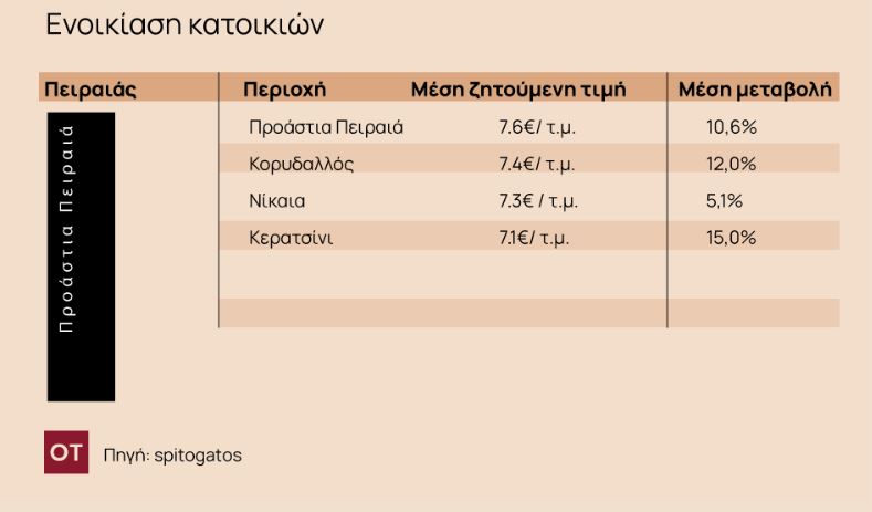 Αναφορικά με την αγορά ενοικίασης, το Κερατσίνι αναδεικνύεται ως η «πρωταθλήτρια» περιοχή, καθώς η ζητούμενη τιμή εκτινάχθηκε 15% υψηλότερα σε σχέση με πέρσι, με τα μισθώματα των κατοικιών να ξεπερνούν τα 7 ευρώ ανά τ.μ. μηνιαίως.