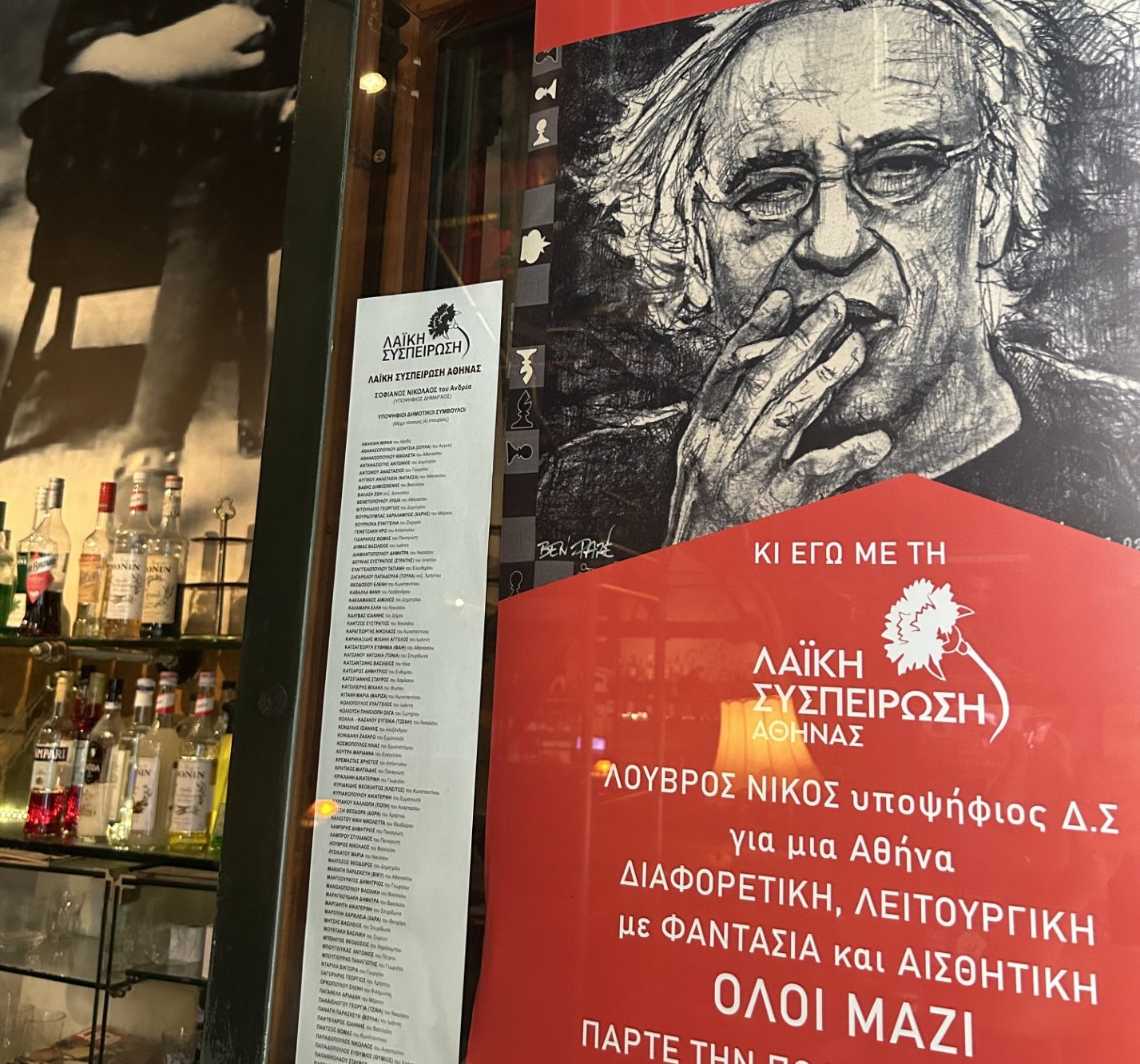 Στην κατακόκκινη -συμβολικά και με ένα γαρύφαλλο- αφίσα ζητάει στις εκλογές στην Αθήνα στις 8 & 15 Οκτώβρη, να «ξαναπάρουμε την πόλη στα χέρια μας. Μαζί κι εγώ με την Λαϊκή Συσπείρωση, για μια Αθήνα ΔΙΑΦΟΡΕΤΙΚΗ, ΛΕΙΤΟΥΡΓΙΚΗ με ΦΑΝΤΑΣΙΑ και ΑΙΣΘΗΤΙΚΗ». Το ψηφοδέλτιο-σιδηρόδρομος του υποψηφίου δημάρχου του ΚΚΕ, Νίκου Σοφιανού, όπου συνωστίζεται και το δικό του όνομα, είναι κολλημένο στην ανοιγμένη τζαμαρία της εισόδου. Εκεί που συνήθως κρέμονται έργα τέχνης ή φωτογραφίες, σήμερα ο Λούβρος, που «αλλαξοπίστησε», γυρνώντας την πλάτη στον ΣΥΡΙΖΑ (με τον οποίο είχε κατεβεί υποψήφιος το 2019), κυριαρχεί η μορφή του Βλαντιμίρ Λένιν.