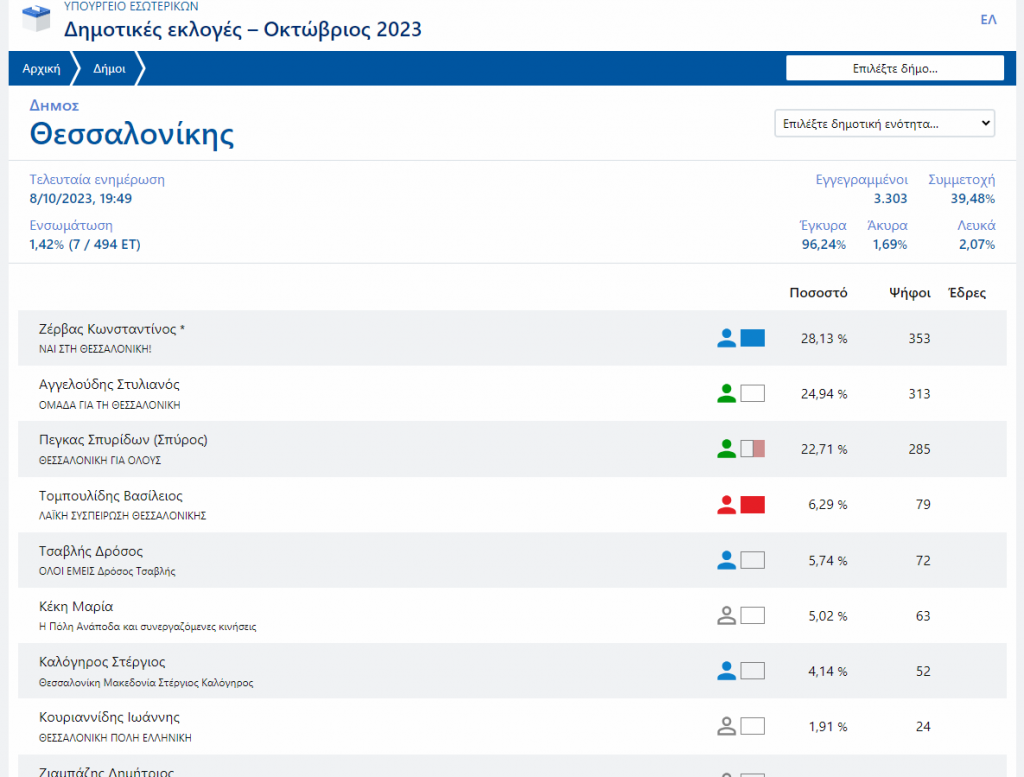 Αν και το ποσοστό ενσωμάτωσης αυτήν την ώρα στον Δήμο Θεσσαλονίκης είναι πολύ μικρό, τα πρώτα αποτελέσματα δείχνουν πως η δημαρχία θα κριθεί στον β’ γύρο των αυτοδιοικητικών εκλογών, μεταξύ του νυν δημάρχου Κωνσταντίνου Ζέρβα και του Στέλιου Αγγελούδη.