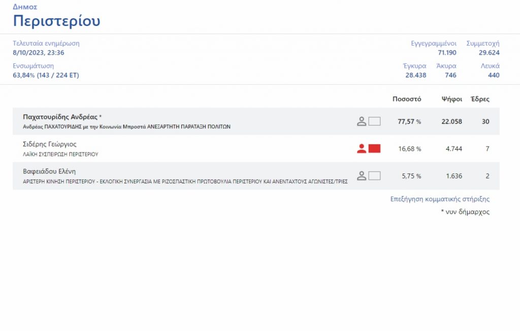 Μάλιστα ο κ. Παχατουρίδης όχι μόνο συγκέντρωσε το απαιτούμενο ποσοστό για να διατηρηθεί στη θέση του, αλλά αύξησε το ποσοστό που είχε λάβει το 2019. Με την ενσωμάτωση των τμημάτων να έχει ξεπεράσει το 60%, το ποσοστό του ήταν κατά 3.6% υψηλότερο (77.57%) από το προ τετραετίας 74%.