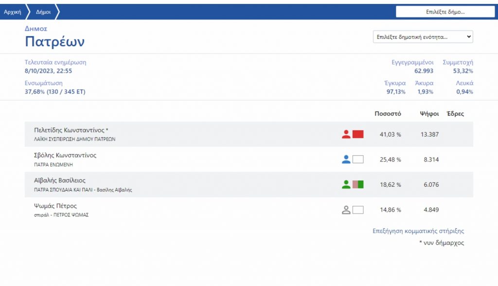 Με την ενσωμάτωση των εκλογικών τμημάτων στον Δήμο Πατρέων να αγγίζει πλέον το 40%, σύμφωνα με τη ροή των επίσημων αποτελεσμάτων από το Υπουργείο Εσωτερικών, ο Κώστας Πελετίδης κινείται στα όρια της επανεκλογής του από τον πρώτο γύρο των δημοτικών εκλογών, παρόλα αυτά δεν φαίνεται ότι στο τέλος θα καταφέρει να φτάσει στο πολυπόθητο 43%.