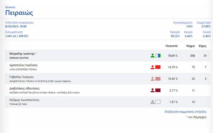 Στα πρώτα επίσημα αποτελέσματα από τον δήμο Πειραιά, στα πρώτα 4 εκλογικά τμήματα ο Γιάννης Μώραλης εμφανίζεται με 70,61 %.