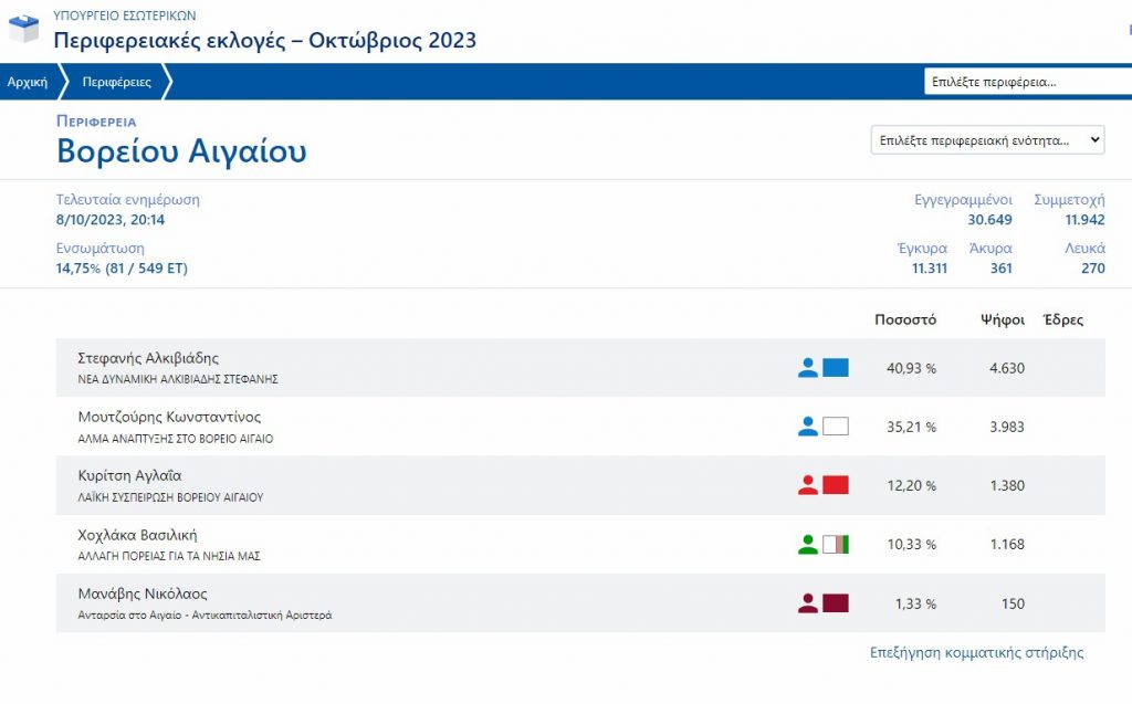 Προβάδισμα καταγράφει ο Αλκιβιάδης Στεφανής στην Περιφέρεια Βορείου Αιγαίου κόντρα στον γαλάζιο αντάρτη και νυν περιφερειάρχη Κώστα Μουτζούρη, σύμφωνα με τα πρώτα επίσημα αποτελέσματα.