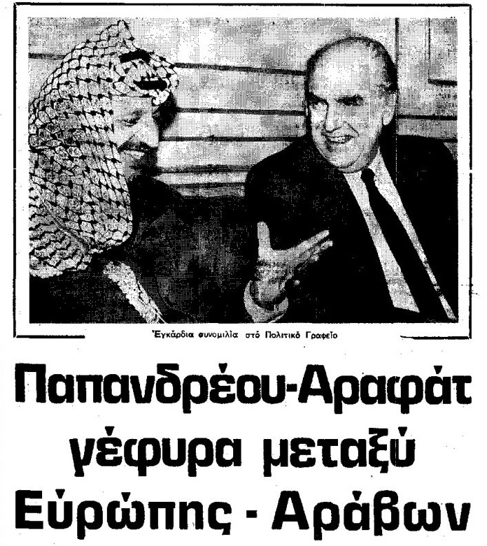 Ακόμα και σε συνέδριο του ΠαΣοΚ έκανε την εμφάνισή του ο ηγέτης των Παλαιστινίων. Άλλωστε το λεγόμενο «Μεσανατολικό» άφηνε συχνά το αποτύπωμά του στην Ελλάδα. Δεν είναι μόνον η υπογραφή της συνθήκης ίδρυσης του κράτους του Ισραήλ που έχει υπογραφεί στο ξενοδοχείο «Ρόδον» της Ρόδου (σήμερα λειτουργεί ως καζίνο εβραϊκών συμφερόντων), είναι και η φιλοξενία χιλιάδων παλαιστίνιων προσφύγων μετά τα αιματηρά (εμφύλια) γεγονότα στη Δυτική Βηρυτό.