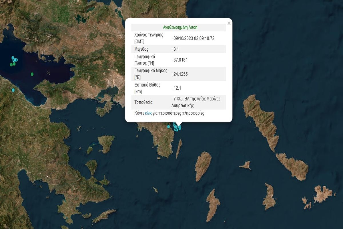 Ασθενής σεισμική δόνηση έγινε σήμερα το πρωί (9/10) στην Αττική. Σύμφωνα με το Γεωδυναμικό Ινστιτούτο ο σεισμός ήταν 3,1 Ρίχτερ και σημειώθηκε 7 χλμ. βορειοανατολικά της Αγίας Μαρίνας Λαυρεωτικής. Ο σεισμός ήταν επιφανειακός με βάθος μόλις στα 12 χλμ.