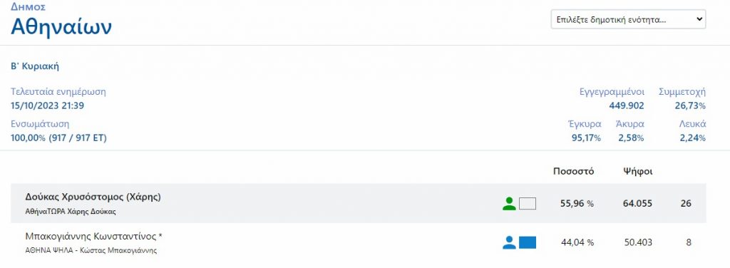 Συγκεκριμένα, με την ενσωμάτωση στο 100%, ο κ. Δούκας συγκέντρωσε το 55,96% και ο κ. Μπακογιάννης το 44,04%.