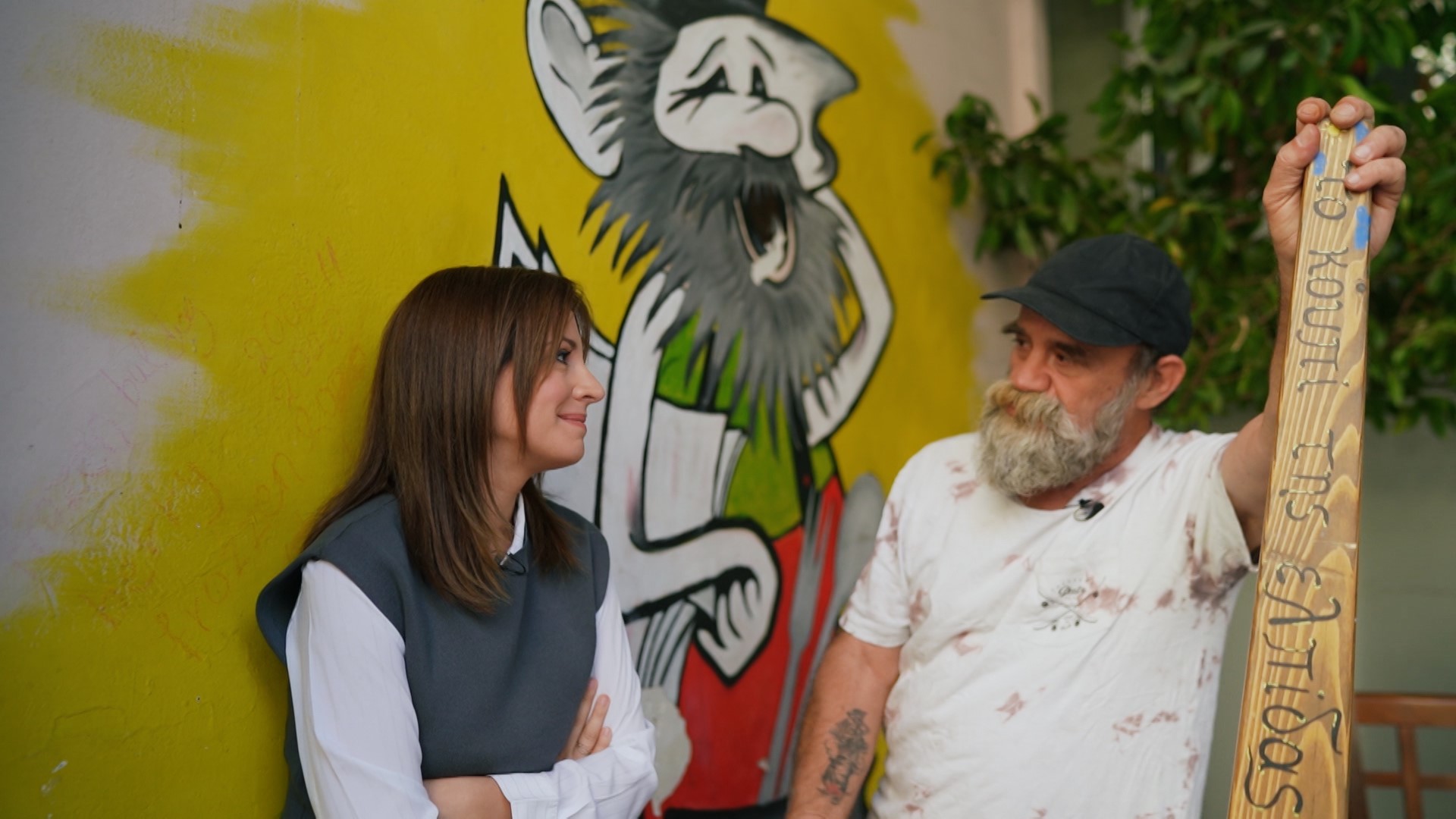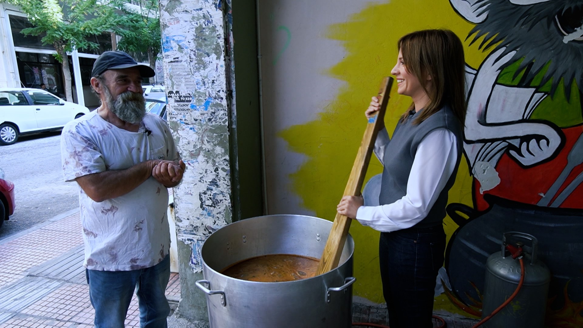Ο δημιουργός της Κοινωνικής Κουζίνας, Κωνσταντίνος Πολυχρονόπουλος, υποδέχεται τη Νίκη Λυμπεράκη στο σπίτι του «Άλλου Ανθρώπου», στο Μεταξουργείο.