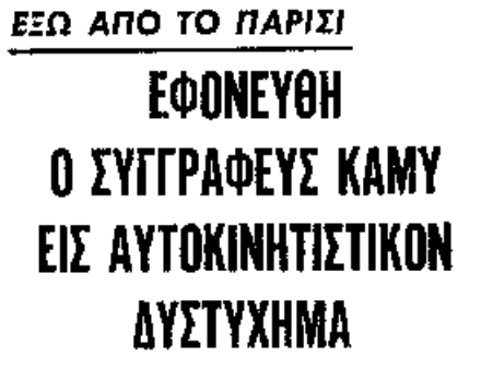 «Ο Γάλλος συγγραφεύς Αλμπέρ Καμύ εφονεύθη σήμερον εις αυτοκινητιστικόν δυστύχημα 60 μίλια νοτίως της πόλεως των Παρισίων εις το Σαπέλ Σαμπινύ.