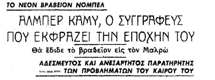 Τότε, «ΤΟ ΒΗΜΑ» της 18ης Οκτωβρίου 1957 έγραφε: «Ακριβώς όμως αυτή είναι η σημασία του έργου του Καμύ: Ότι ο άνθρωπος αυτός , ο οποίος έχει με το έργο και την προσωπικότητά του καθρεφτίσει τόσο πολύ τα προβλήματα και τις αγωνίες του καιρού του, ο οποίος υπήρξε μάλιστα πολιτικός, αρθρογράφος και σχολιαστής, δεν δεσμεύθηκε ποτέ από κανένα κόμμα και καμμιά παράταξι, αρνούμενος κάθε “ένταξι” στερητική της ανεξαρτησίας του και κρίνοντας το σύνολο των προβλημάτων που επεξεργάζετο και των πτυχών που άγγιζε με τα κριτήρια και την προοπτική του ανθρωπισμού.