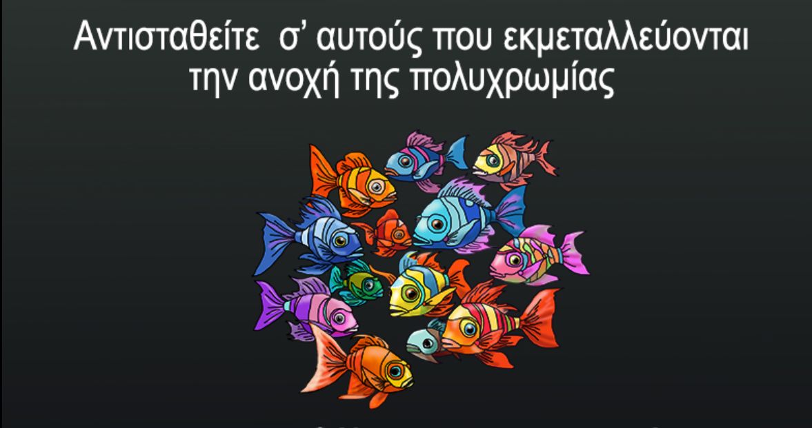Ο Αρκάς με ένα σκίτσο στο οποίο απεικονίζει ένα πολύχρωμο κοπάδι ψαριών, αναφέρεται στην πολυχρωμία, την αυτοδιάθεση, το σεβασμό στο διαφορετικό.