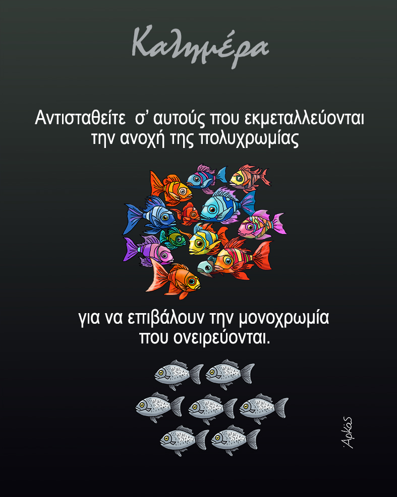 Το πρόταγμα του αγαπημένου σκιτσογράφου είναι το «αντισταθείτε» σε «αυτούς που ονειρεύονται τη μονοχρωμία»