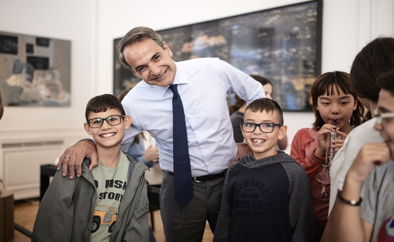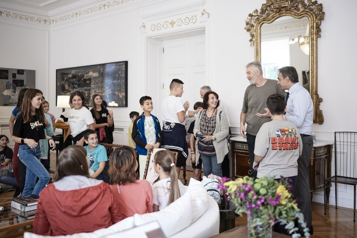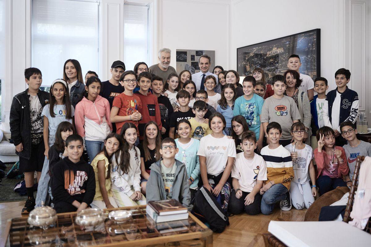 Το σαλόνι του Μεγάρου πλημμύρισε από παιδιά και δασκάλους και ο πρωθυπουργός Κυριάκος Μητσοτάκης είχε την ευκαιρία να απαντήσει σε ερωτήσεις για την ιστορία του κτιρίου, για τις δραστηριότητες που φιλοξενεί και για τις υποχρεώσεις που έχει ως πρωθυπουργός μεταδίδει η ΕΡΤ.