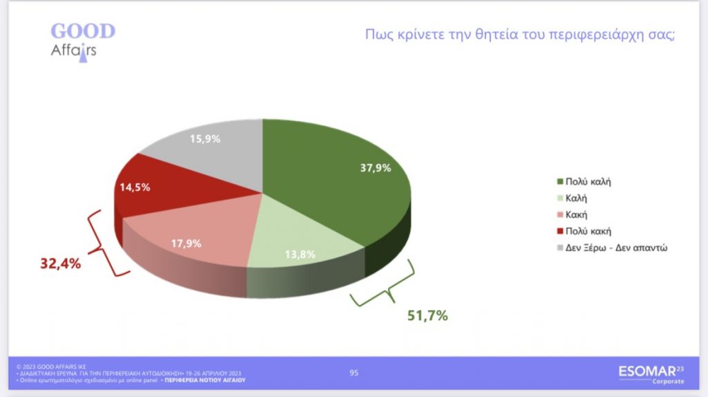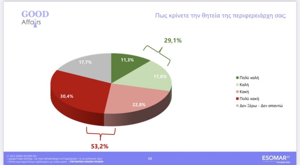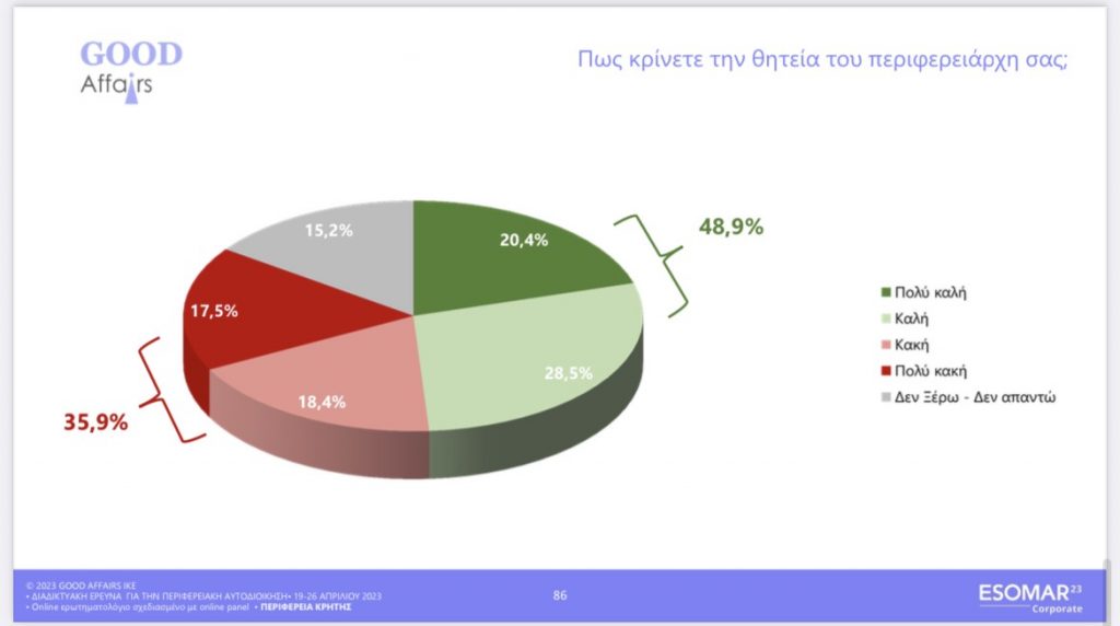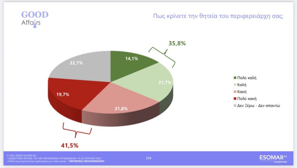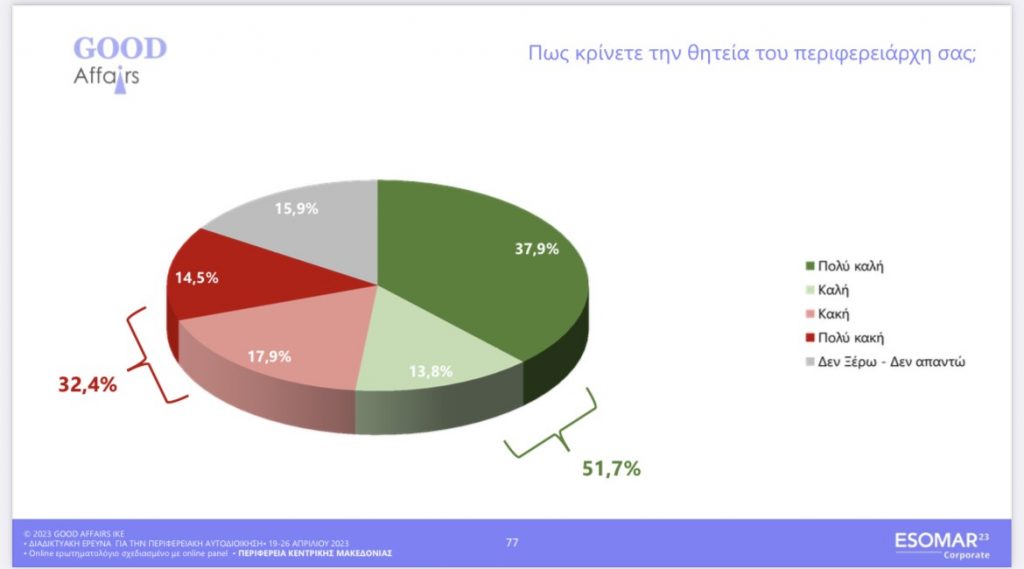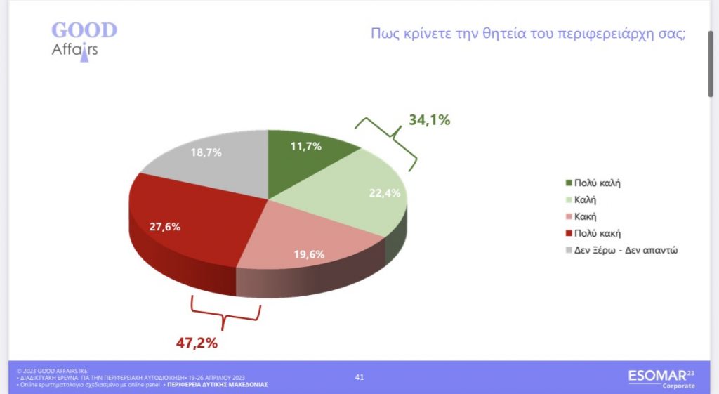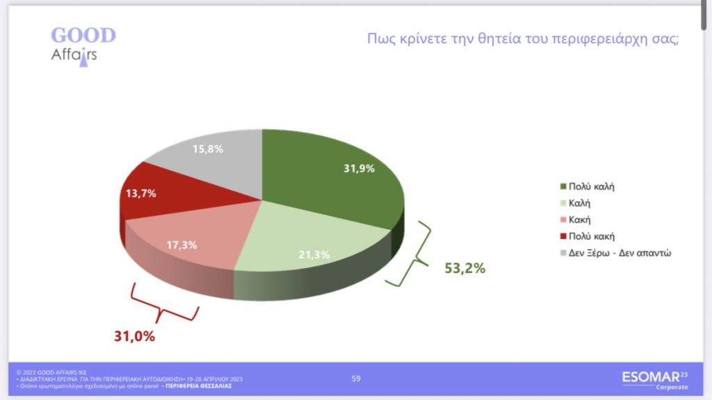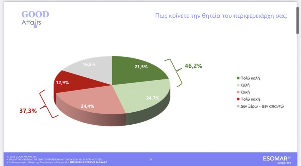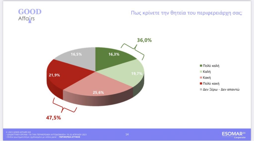 Η εταιρεία Good affairs ξεκίνησε από τον Νοέμβριο του 2022 να μετρά την απόδοση των περιφερειαρχών σε όλη την επικράτεια. Η πανελλαδική έρευνα επαναλήφθηκε στο τέλος Απριλίου και τα συμπεράσματα για τις τάσεις επιβεβαιώθηκαν στις εκλογές που μόλις διεξήχθησαν.