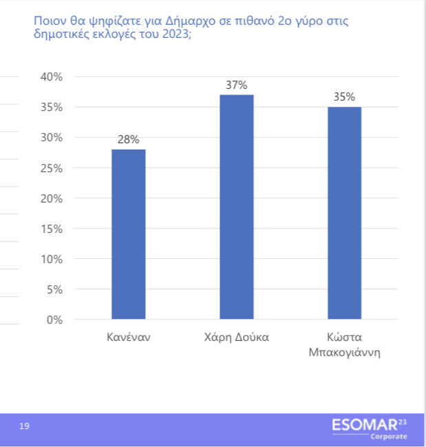 Ταυτόχρονα 40 μέρες πριν τις εκλογές επιχειρήσαμε να δούμε τι συμβαίνει στην πρωτεύουσα της χώρας, λίγες μέρες αφότου έγιναν γνωστοί οι υποψήφιοι δήμαρχοι που θα διεκδικούσαν τον δήμο της Αθήνας. Τότε με βάση τα ευρήματα της έρευνας είχα κάνει το εξής σχόλιο «Η μάχη της Αθήνας φαίνεται πως είναι πιο ανοιχτή από ότι αναμενόταν. Στην έρευνα που έγινε μεταξύ 7-12 Σεπτεμβρίου, την εποχή που η κακοκαιρία Daniel χτύπησε τη πατρίδα μας και ως εκ τούτου έχει επηρεάσει τους ερωτηθέντες εκείνης της περιόδου, ο νυν δήμαρχος Κώστα Μπακογιάννης είναι μεν πρώτος αλλά απέχει από το ποσοστό του 2019 και την εκλογή από την πρώτη Κυριακή. Η δεύτερη θέση, την περίοδο που έγινε η έρευνα, φαίνεται να είναι ανοιχτή μεταξύ τριών. Του κ. Ζαχαριάδη ο οποίος προηγείται ελαφρώς αλλά εδώ θα πρέπει να δούμε αν η εκλογή του κ. Κασσελάκη τον ευνοήσει ή του στοιχίσει μιας και ο ίδιος ήταν υποστηρικτής της κα. Αχτσιόγλου, του κ. Δούκα ο οποίος φαίνεται πως σε περίπτωση που κάνει την έκπληξη και περάσει στον 2ο γύρο κοντράρει στα ίσα τον κ. Μπακογιάννη».