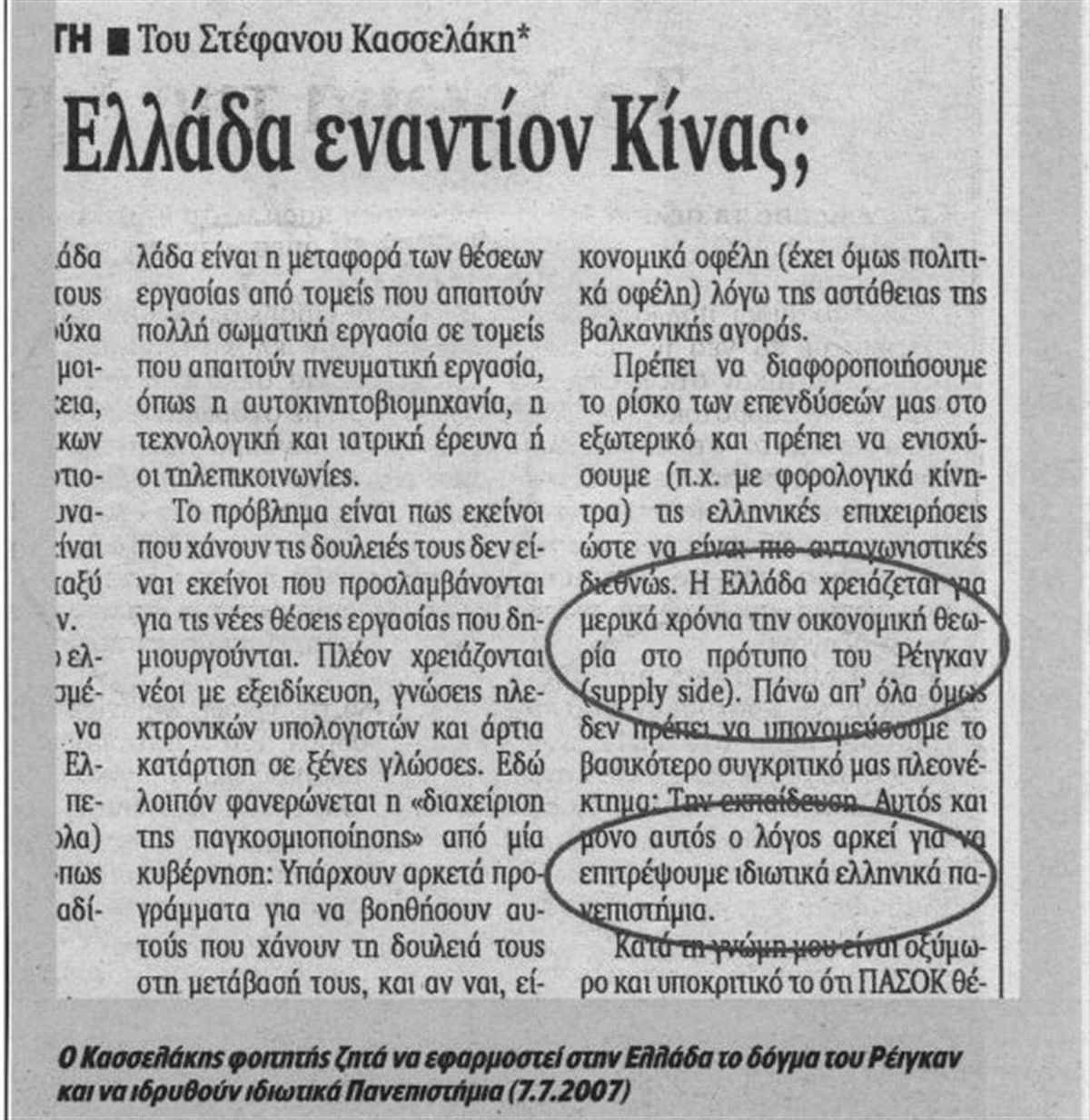 Υπέρ των μικρότερων μισθών στην Ελλάδα, με στόχο την τόνωση της ανταγωνιστικότητα της οικονομίας, καθώς και υπέρ των ιδιωτικών πανεπιστημίων, τασσόταν στα 24 του ο αρχηγός της αξιωματικής αντιπολίτευσης, Στέφανος Κασσελάκης.