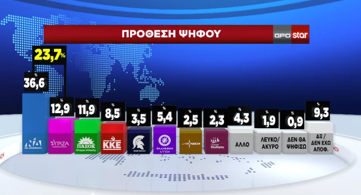 Ειδικότερα, στην πρόθεση ψήφου η Νέα Δημοκρατία συγκεντρώνει 36,6%. Ο ΣΥΡΙΖΑ πέφτει στο 12,9%, μόλις στη μία μονάδα διαφορά από το ΠαΣοΚ που ωστόσο παραμένει στο 11,9%. Ακολουθούν, ΚΚΕ 8,5%, Σπαρτιάτες 3,5%, Ελληνική Λύση 5,4%, Νίκη 2,5% και Πλεύση Ελευθερίας 2,3%.